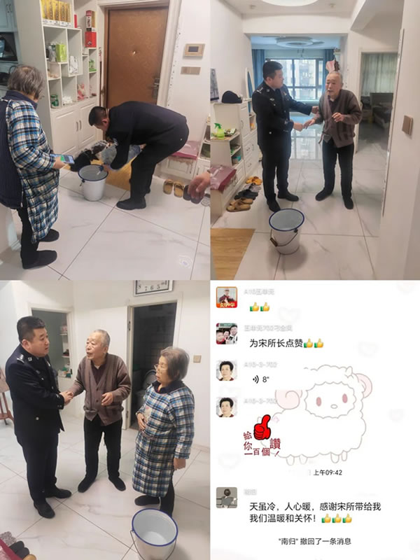 五一假期這天,萬福國際小區(qū)因線路問題,突然停水,A棟3單元的兩位老人剛要做飯,卻發(fā)現(xiàn)停水了,由于年紀(jì)大了下樓打水不方便,于是便在網(wǎng)格群里說了一句家里沒有水做不了飯。這一訴求被同在群內(nèi)的奮斗派出所所長宋艷冬看在眼里,于是不到十分鐘便親自把生活用水送到了兩位老人家中,兩位老人激動(dòng)地拉著宋所長的手,眼里飽含淚光和感激!