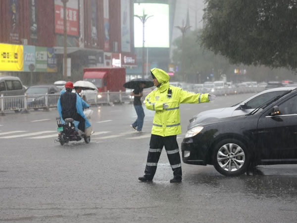 大雨中,交警們腳踏積水,穿梭在密集的雨幕中,他們的身體隨著車(chē)流變化時(shí)而左轉(zhuǎn)、右轉(zhuǎn),抬手、揮臂,不斷發(fā)出指令,讓車(chē)輛按照交通標(biāo)志和信號(hào)燈的指示行駛,提醒過(guò)往駕駛員減速慢行,注意雨中行車(chē)安全。雨水順著他們的臉頰滴下,汗水浸透了他們的內(nèi)衣,鞋襪早已灌滿(mǎn)了雨水,即便如此,也沒(méi)有改變他們颯爽英姿的指揮動(dòng)作,更沒(méi)有撼動(dòng)為民服務(wù)的心!那一抹抹熒光綠讓人安心又感動(dòng)。