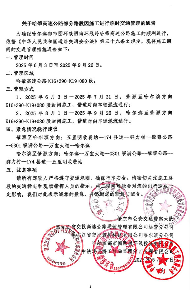 關于哈肇高速公路部分路段因施工進行臨時交通管理的通告