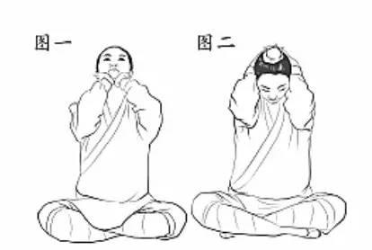 十指交叉抱于腦后,上體左轉45度,然后右傾,抻拉左脅肋部,略停兩秒后恢復上體正直,再左傾抻拉右脅肋部;然后,頭向上充分抬起,兩手在頸下稍稍向上助力,與頸部形成爭力,略停兩秒(如圖1);慢慢低頭,兩掌抱頭下按,略停兩秒(如圖2)。