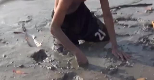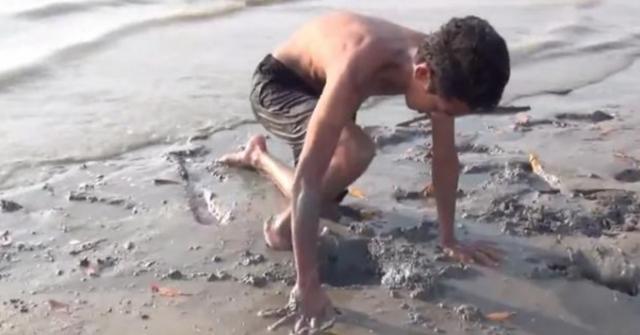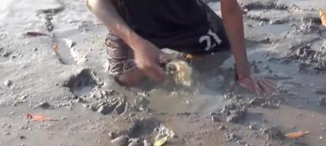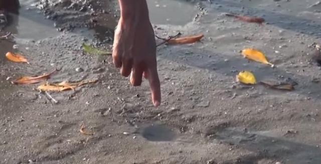 有幾名男孩就在退潮后去海灘上趕海時,在泥潭上發現兩個洞,一個大的一個小的,現象著實奇特。 為了一探究竟,其中一位男孩把手伸進了大洞里,令人驚奇的是,旁邊的小洞竟冒出了高高的水柱!