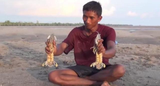 之后男孩又陸續發現了大大小小的蝦洞,并且收獲了不少!