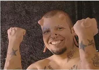 美國有位路易桑切茲的兄臺,為了讓自己看起來像一頭小牛,也是在自己的額頭做功課,愣是移植了兩只“角”,不只如此,他還給自己裝了耳環和鼻環。要是“犄角”再長一些點,加上一個假頭套,活脫脫就是西游記里跳出來的牛魔王。